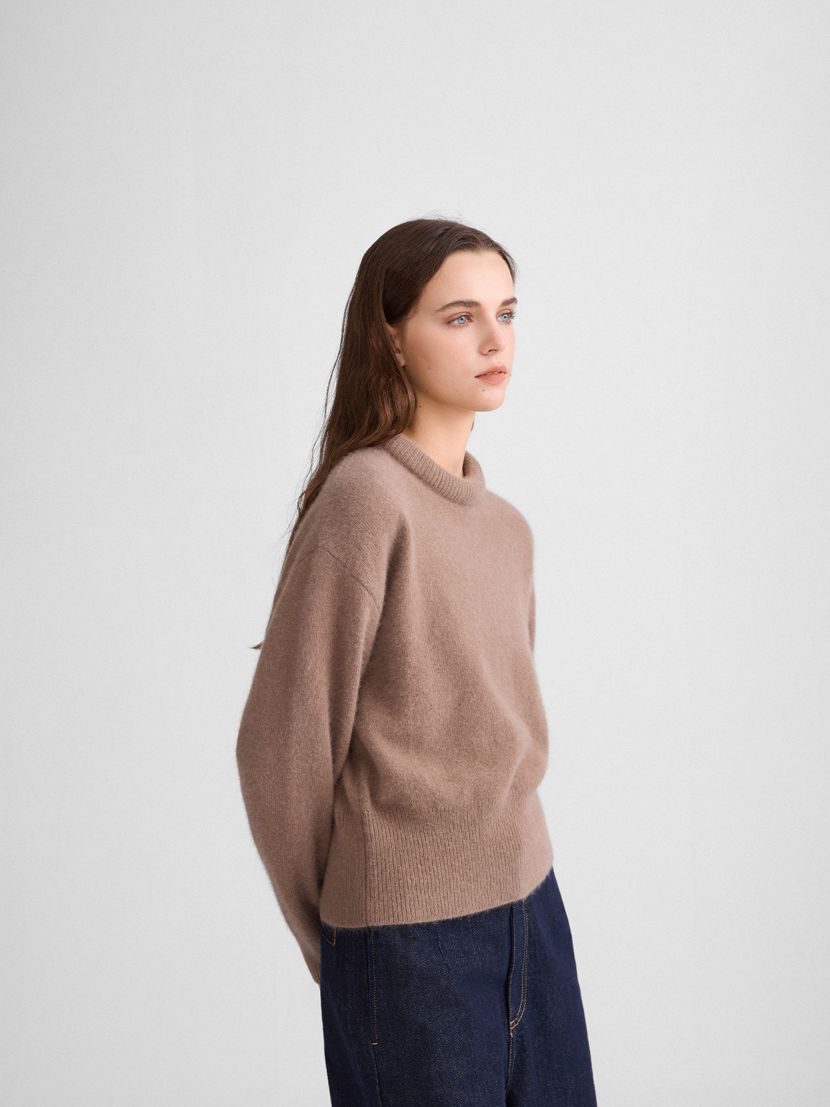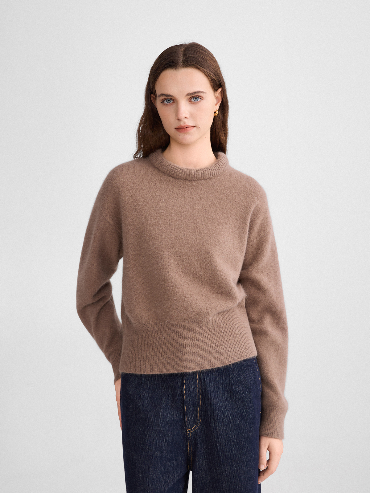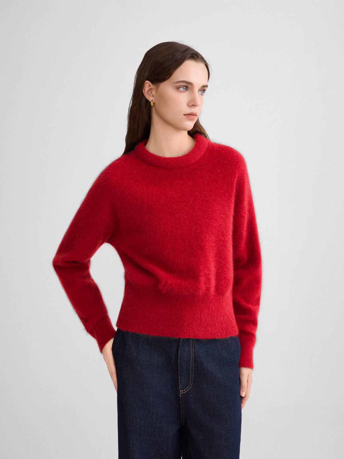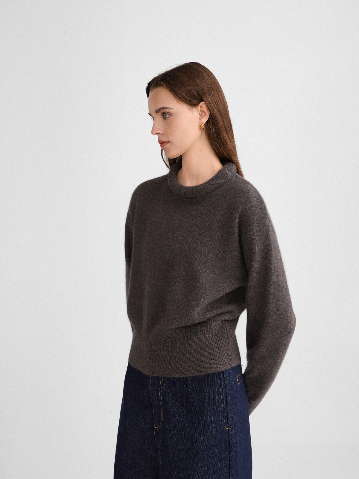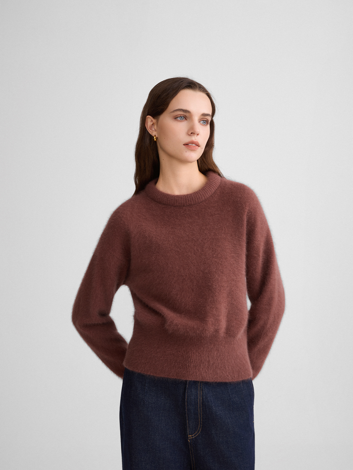 The rumah balloon neck fox fleece knitted sweater cloud mousse short slim knitted crew neck top