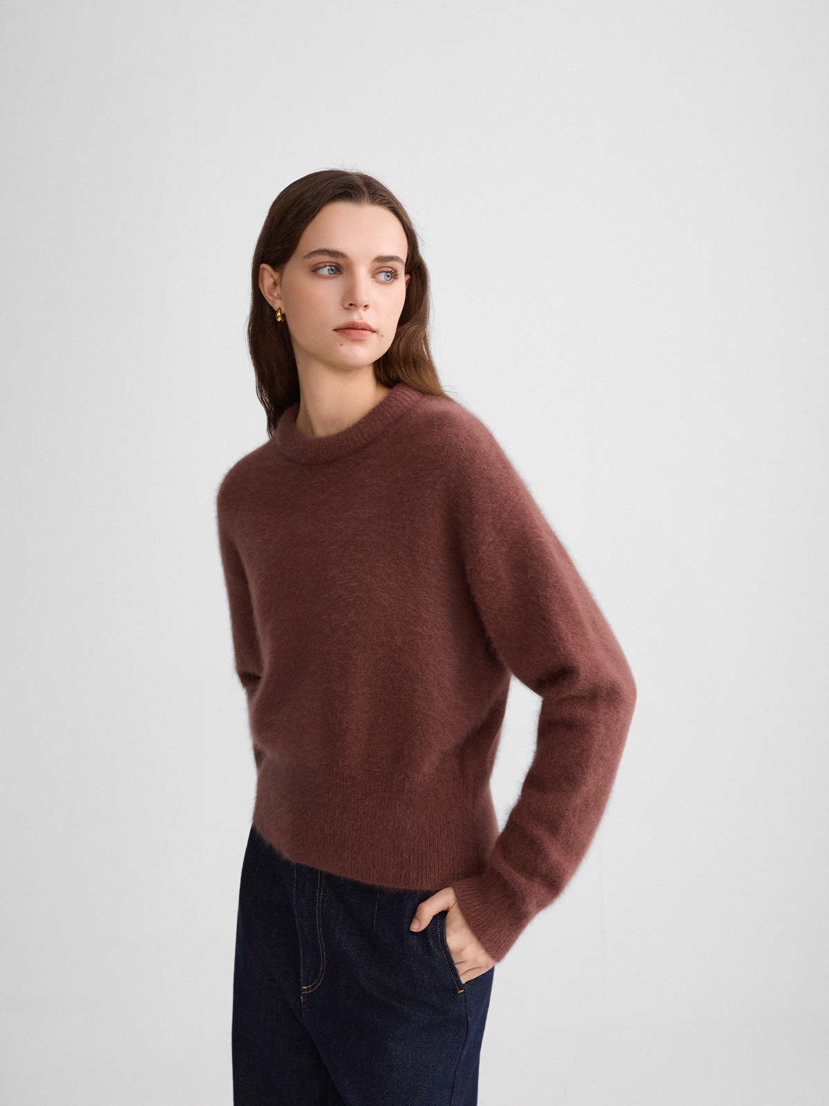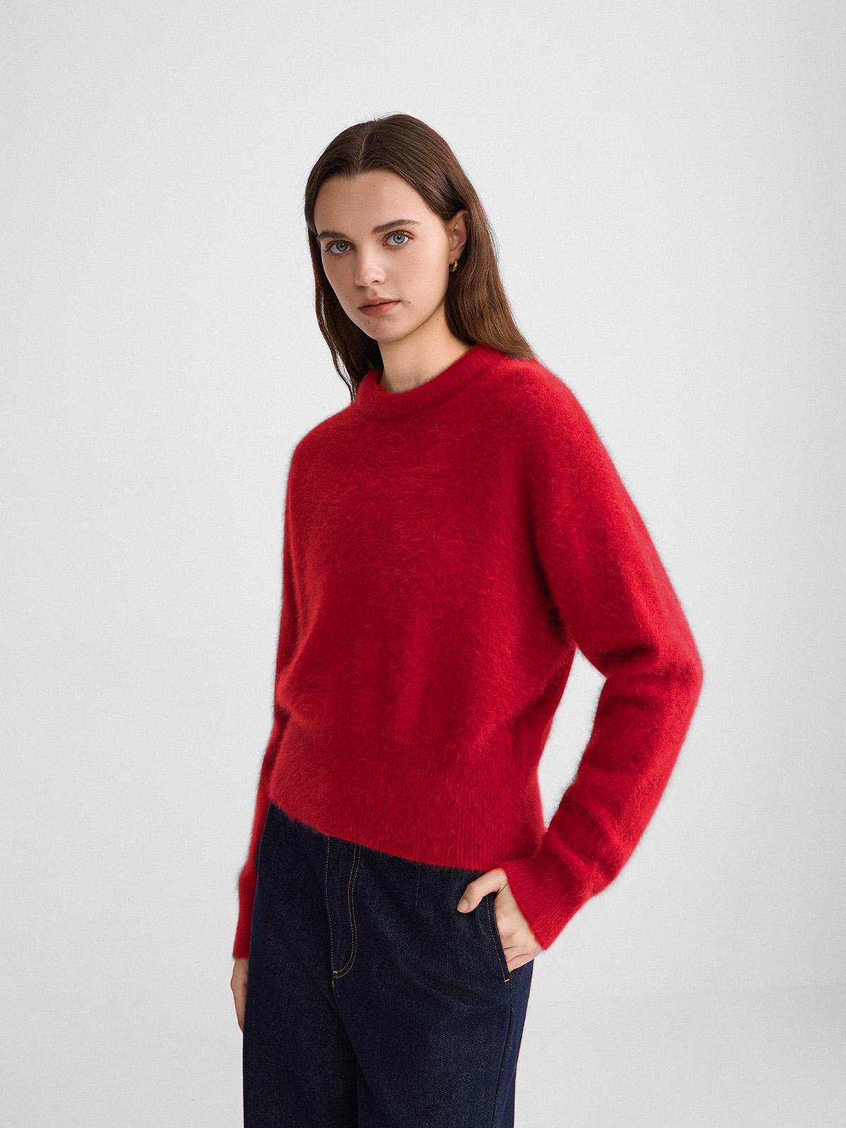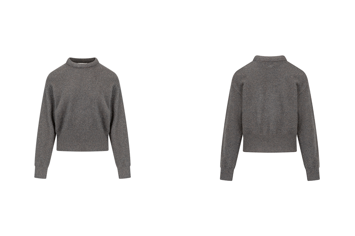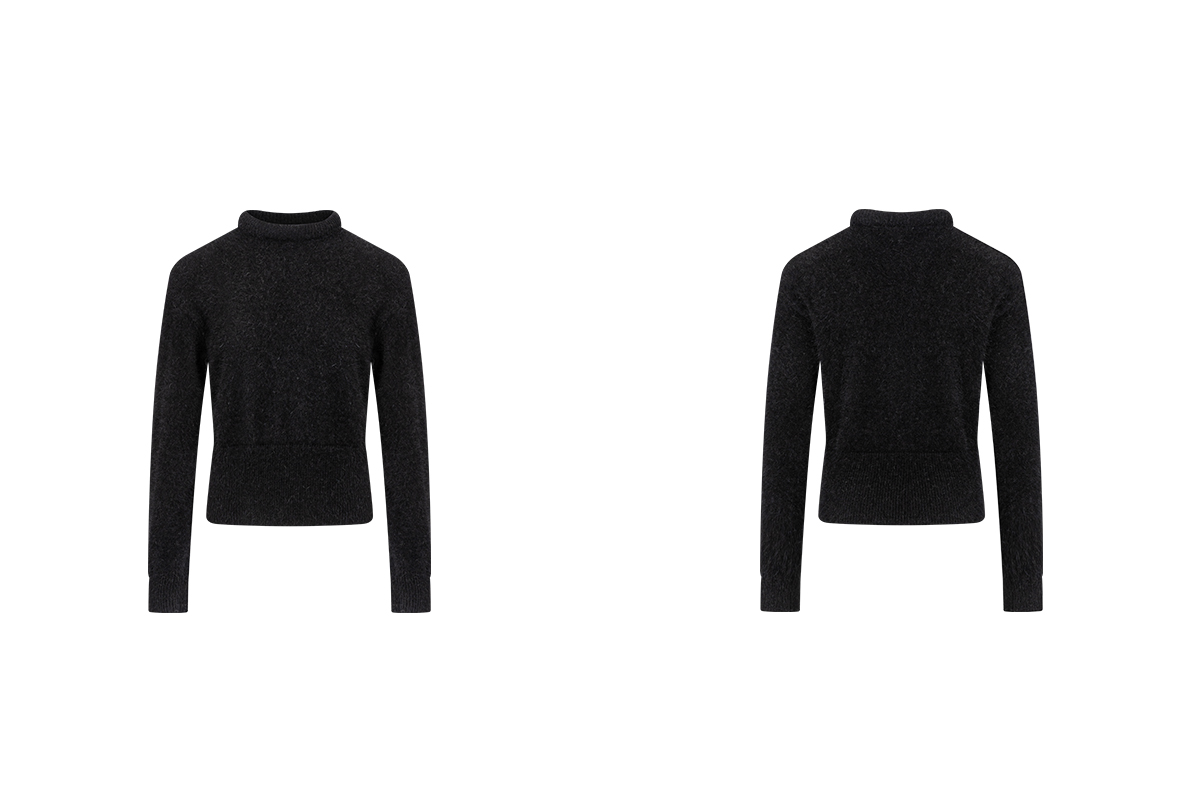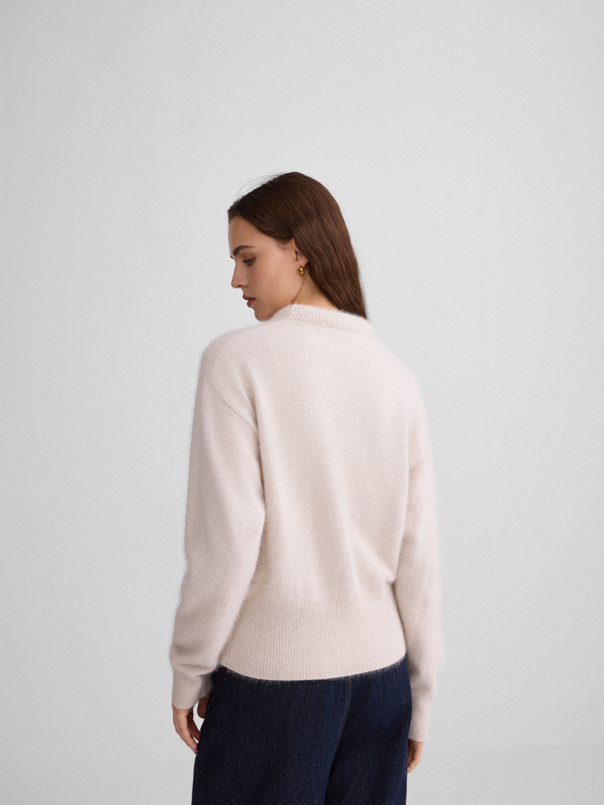 The rumah balloon neck fox fleece knitted sweater cloud mousse short slim knitted crew neck top
