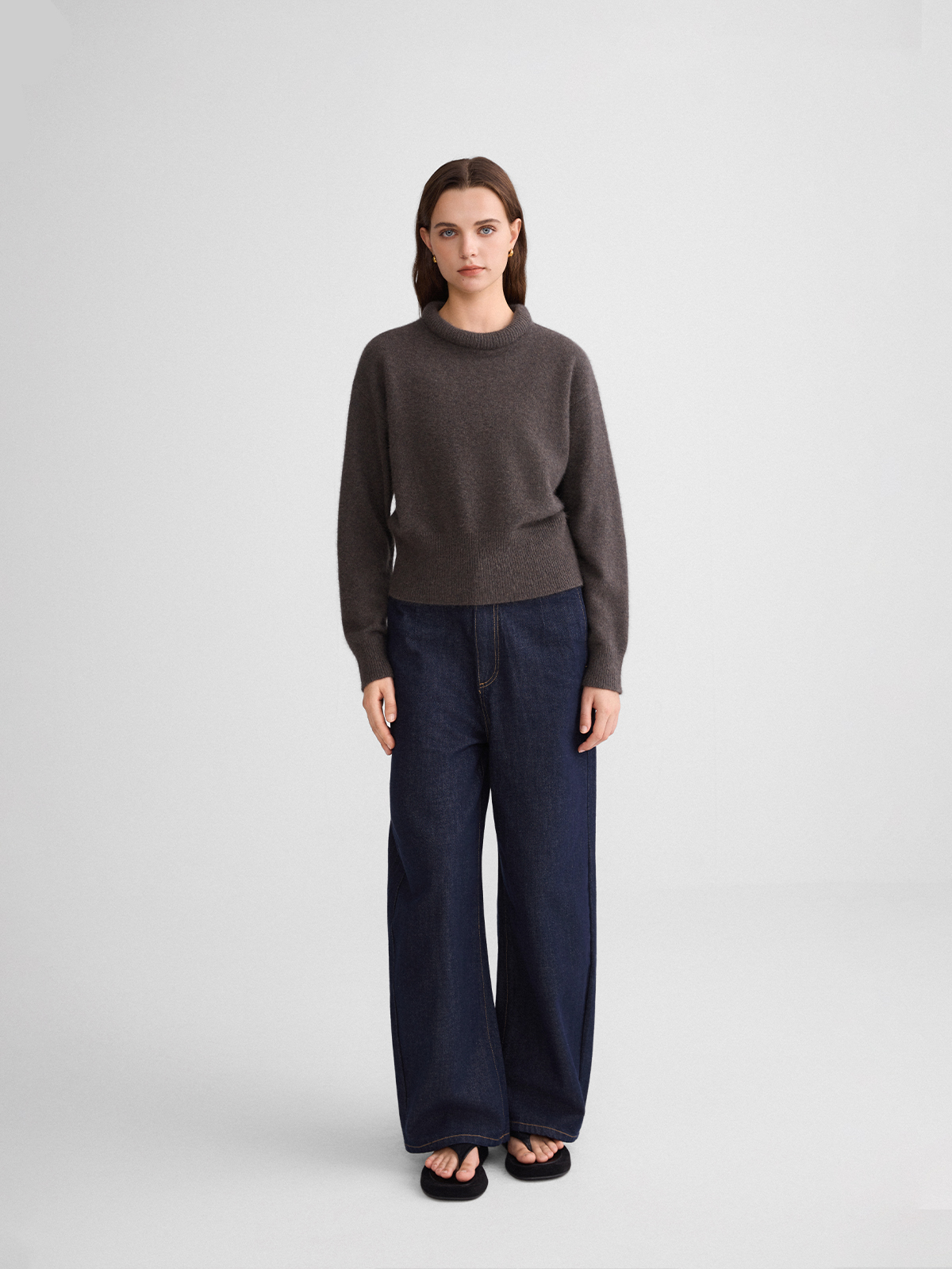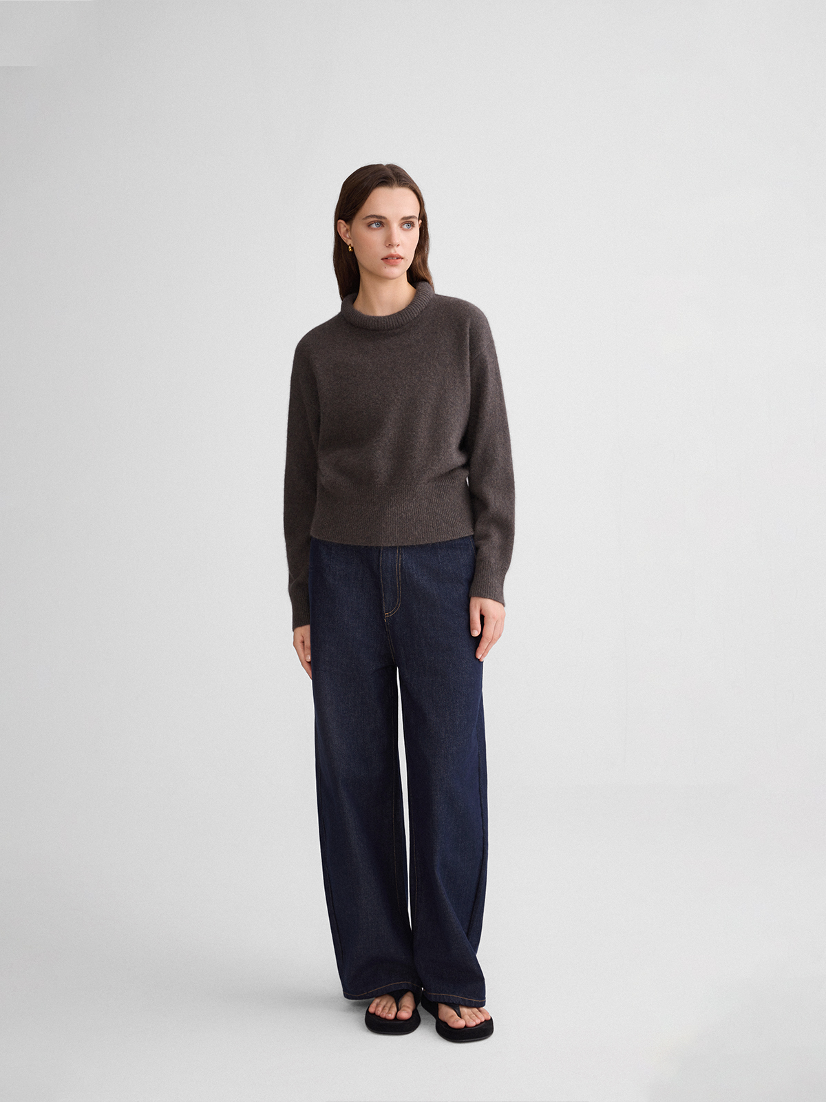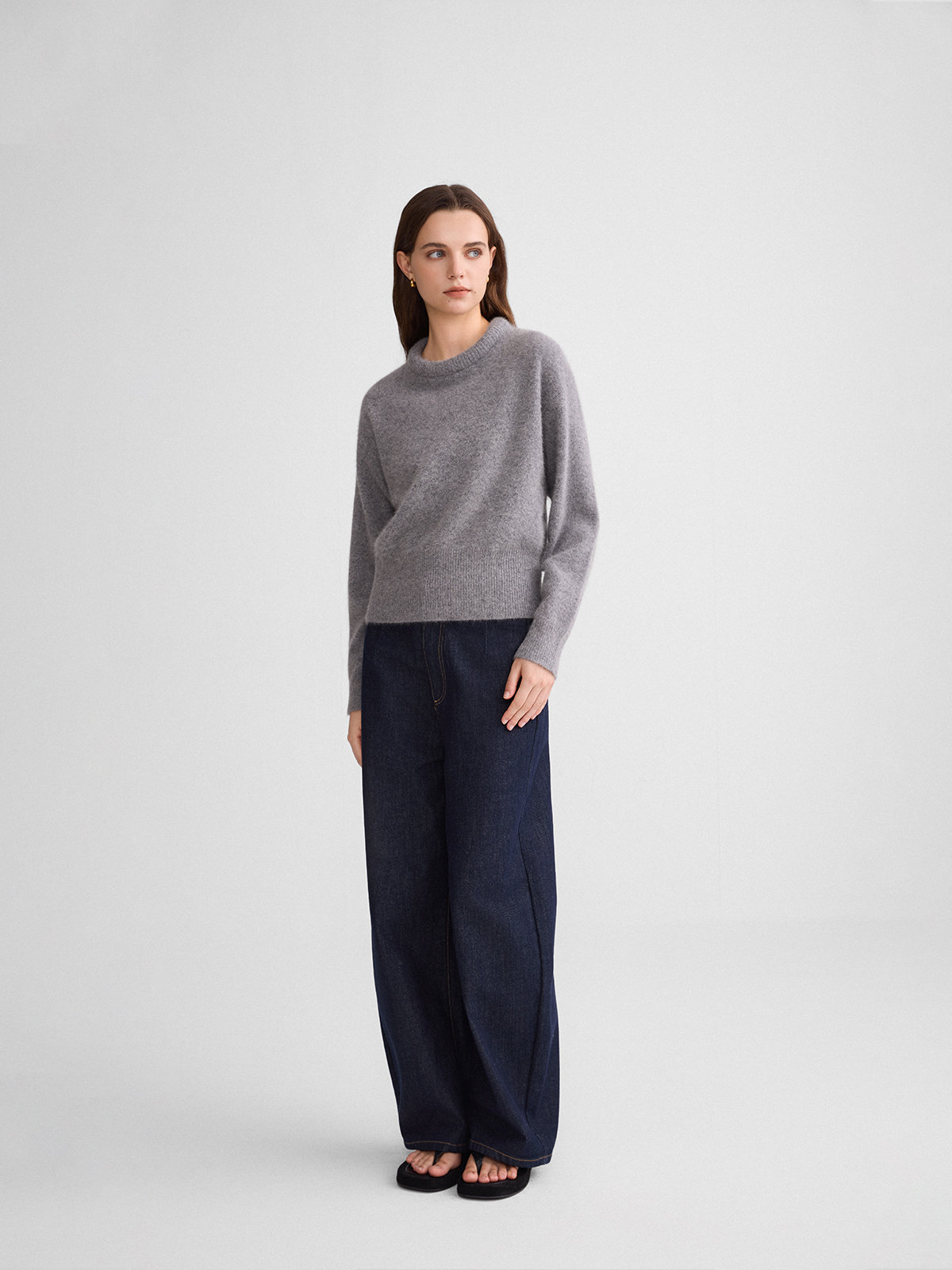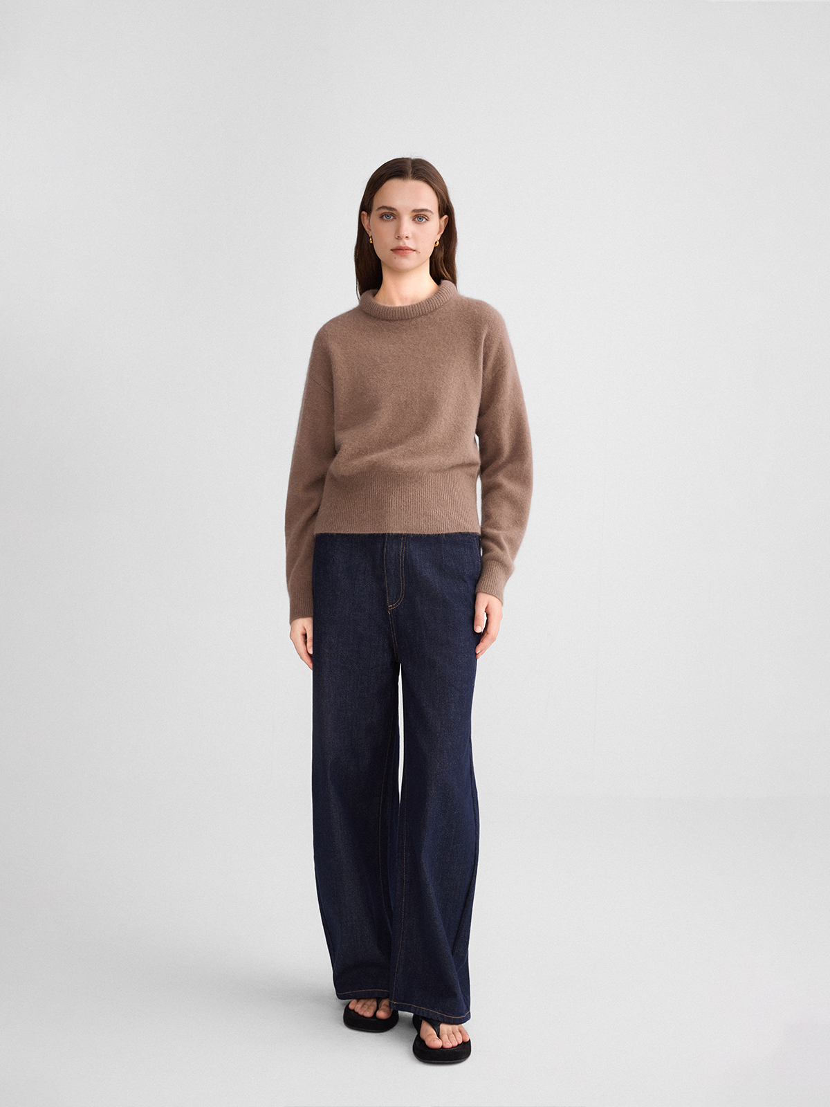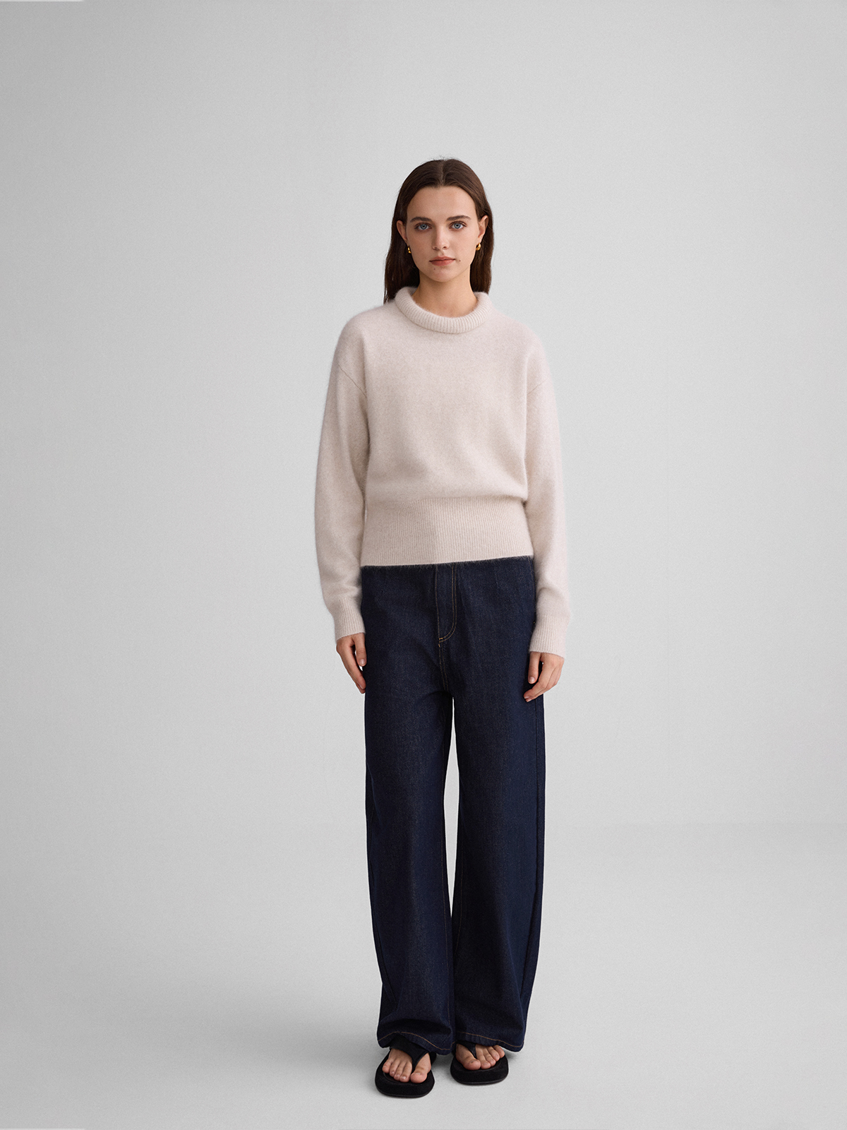 The rumah balloon neck fox fleece knitted sweater cloud mousse short slim knitted crew neck top